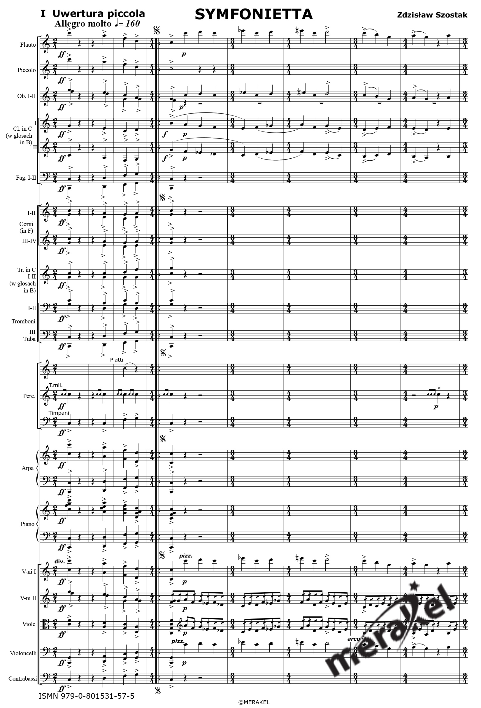 PERC. (3 executore): Timpani, Piatti, Tamburo Militare (T.mil.), Xilofono, Marimba, Hi-Hat, Campanelli, G.C., Piatti (solo, e due), Triangolo, Tam-Tam, Miotełki, Bong, Tamburino (T.d B), Vibrafono, Bongosi, Tempel Blocki (T.bl.), Campanelli